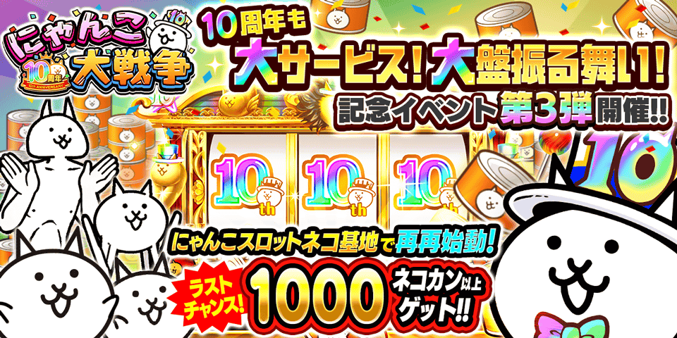・10周年記念「にゃんこスロット」開催中!誰でも簡単にネコカン1000個以上をゲットできます。