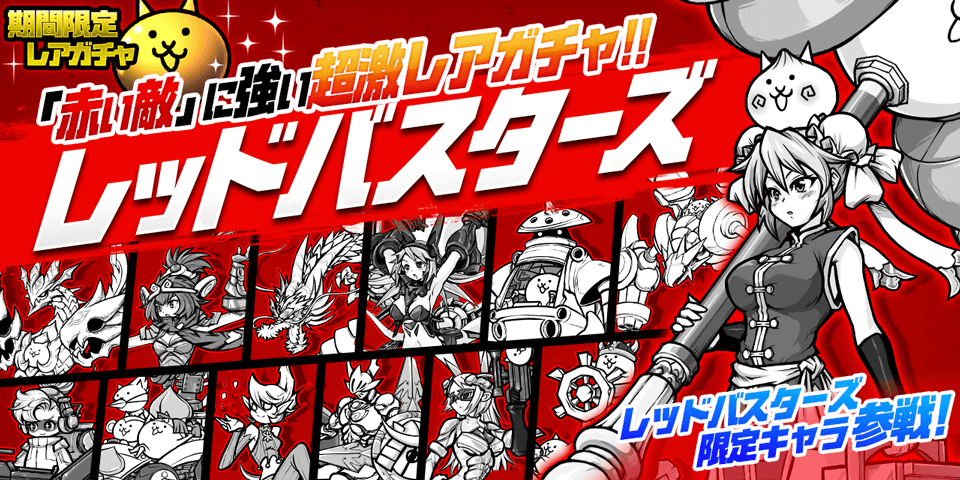 赤い敵に強い超激レアキャラクターが集結した限定レアガチャ「レッドバスターズ」を開催いたします。