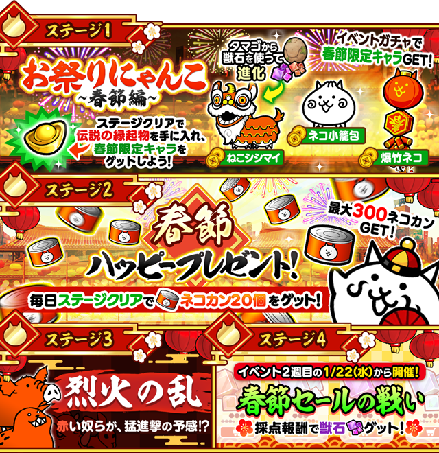 他にも毎日クリアでネコカンが入手できる「春節ハッピープレゼント!」や、赤い敵たちが続々と襲撃する「烈火の乱」も登場!