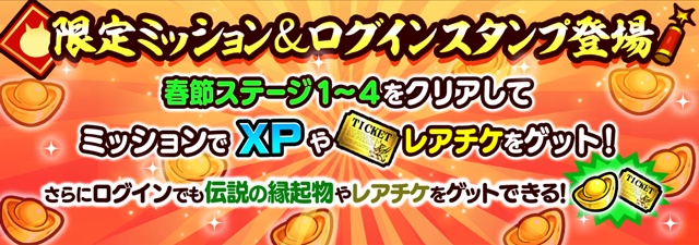 ミッションクリアや毎日ログインで、豪華報酬「伝説の縁起物」や「レアチケット」をゲットしてくださいね!